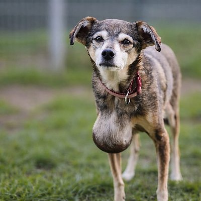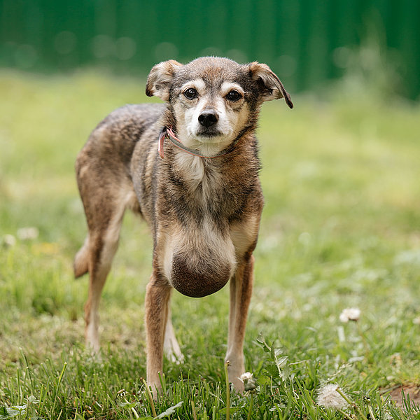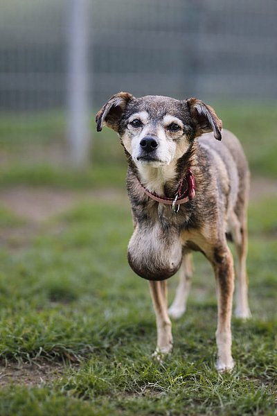 Trixie hat eine große Umfangsvermehrung, wie auf ihrem Bild zu erkennen ist. Diese muss zumindest teilweise entfernt werden um ihre Lebensqualität zu verbessern. In wie weit der Tumor komplett entfernt werden kann, wird sich allerdings erst in der OP herausstellen.